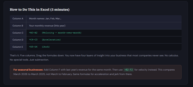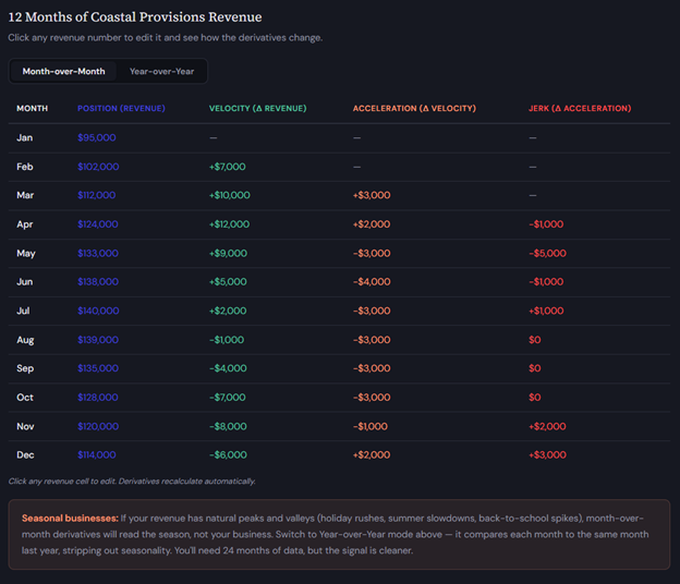 One note on seasonality: If your business has natural peaks and valleys — holiday rushes, summer slowdowns — month-over-month derivatives will read the season, not the business. Compare each month to the same month last year instead. Year over year — March 2026 minus March 2025. Same formulas for acceleration and jerk from there. You'll need 24 months of data, but the signal is cleaner.