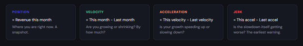 Pull up your monthly revenue for the past 12–24 months. Add three columns of subtraction. Look at the pattern. Is your growth accelerating or decelerating? Has jerk turned negative? If it has, the first question isn't what to cut. It's what changed.